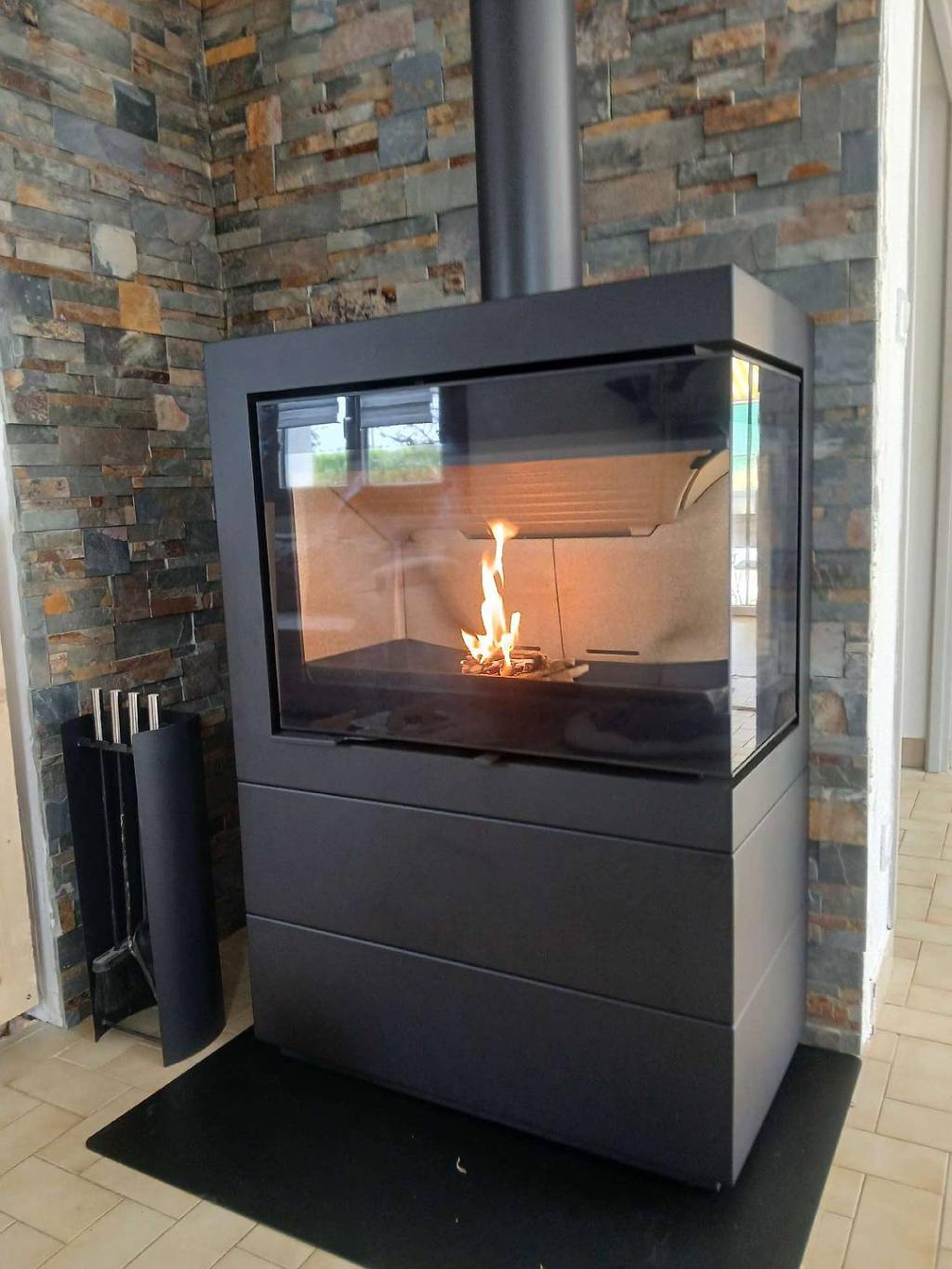 L’ancien foyer rustique a laissé place à un espace lumineux et moderne, où le mur en parement pierre met en valeur le design du poêle. Grâce à sa vitre d’angle, la flamme est visible depuis la salle à manger et la cuisine ouverte, créant une ambiance cosy et contemporaine. Une vraie réussite technique et esthétique.