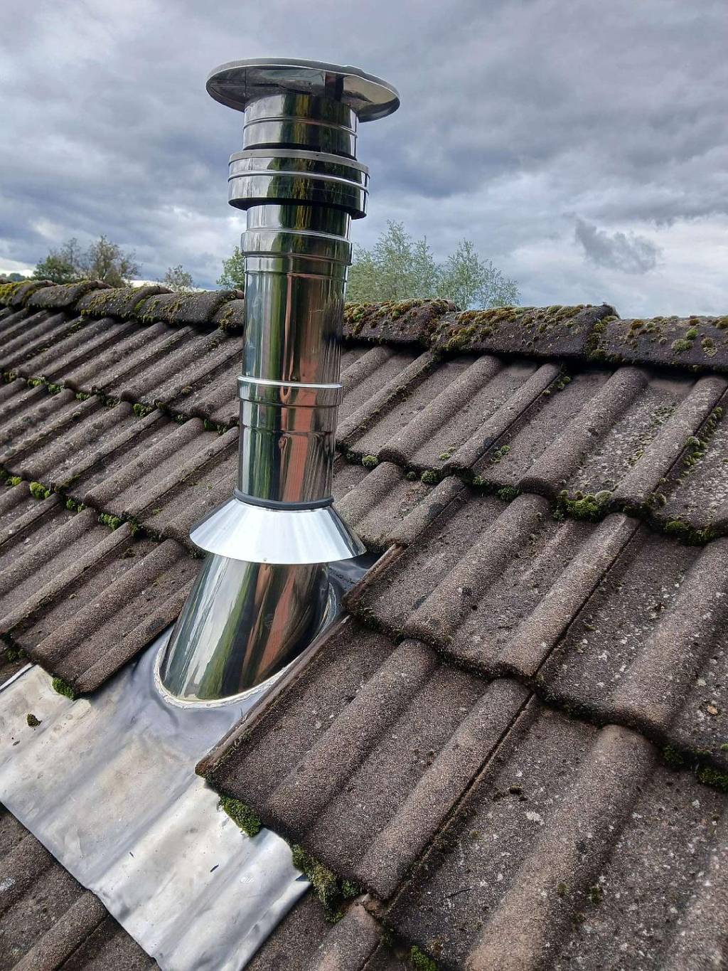 Le poêle a été raccordé sur un conduit concentrique, assurant à la fois l’arrivée d’air comburant et l’évacuation des fumées. Ce conduit sera prochainement coffré au premier étage pour une finition discrète et élégante.